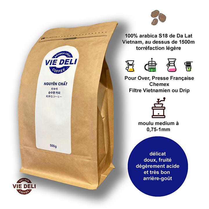 100% hạt Cà phê bột Arabica Cầu Đất của Đà Lạt, nổi tiếng thơm ngon, mọc ở vĩ độ thích hợp và độ cao trên 1.500m so với mực nước biển tại cao nguyên Lâm Viên, Việt Nam, chế biến rửa sạch hoàn toàn, nguyên chất, không tẩm, không hương liệu và không chất bảo quản, được rang bằng khí nóng ở mức nhẹ (light), nghiền thô để pha bằng dụng cụ pha rót (Pour Over), bằng bình ép kiểu Pháp (French Press), hoặc nếu thích thì xay mịn để có thể pha bằng máy pha cà phê espresso, bình moka và các dụng cụ pha chế khác.