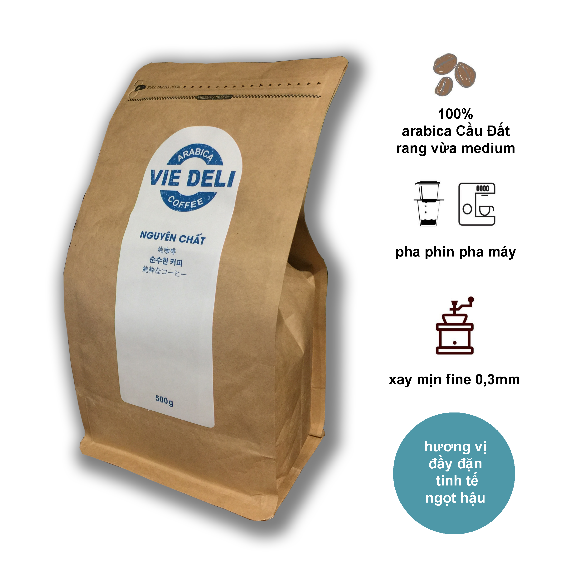 100% hạt cà phê bột Arabica Cầu Đất từ Đà Lạt, Việt Nam, nổi tiếng thơm ngon, mọc ở vĩ độ thích hợp 1.500m so với mực nước biển trên cao nguyên Lâm Viên, chế biến rửa sạch hoàn toàn, nguyên chất, không hương liệu và không chất bảo quản, rang vừa bằng không khí nóng, xay mịn để có thể pha bằng máy pha cà phê espresso, bình moka và các dụng cụ pha chế khác.
