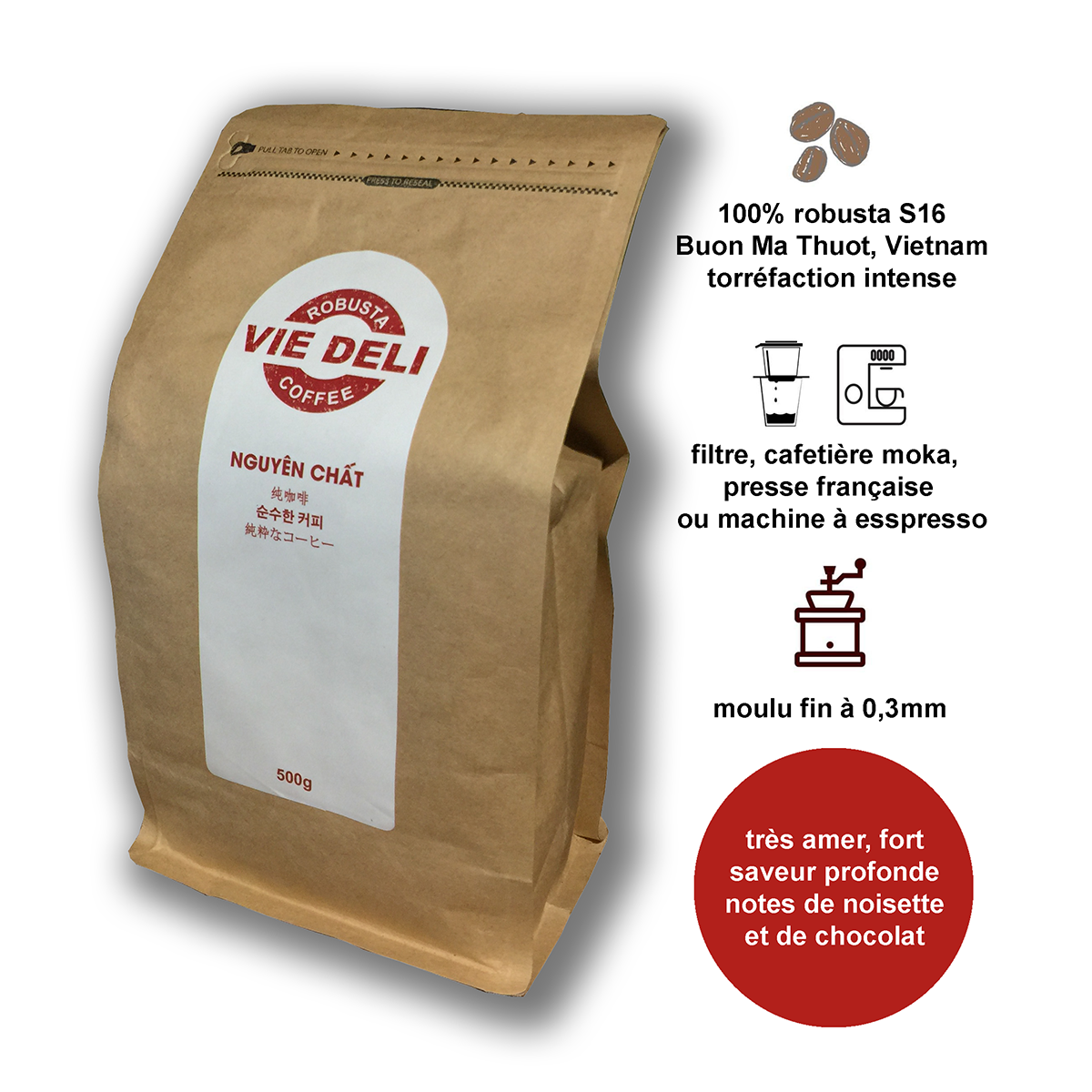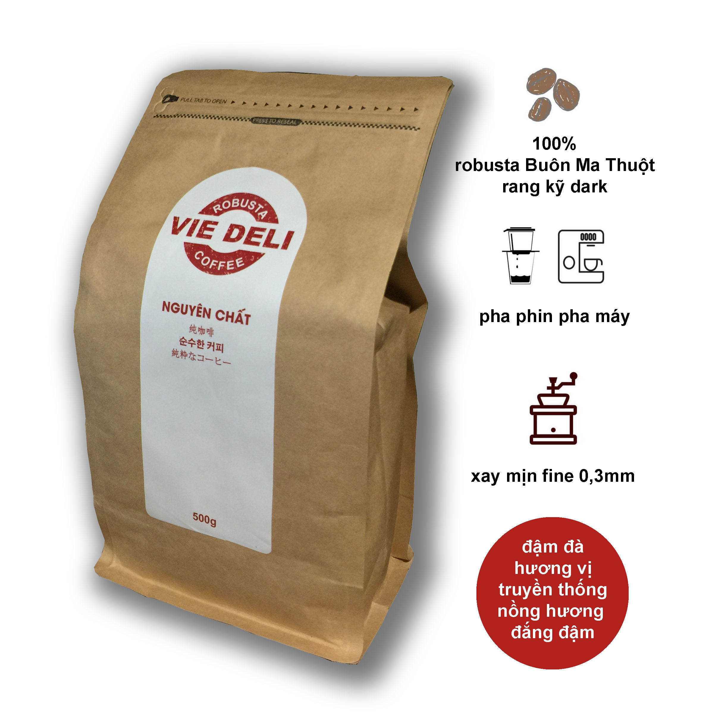 – 100% Cà phê bột Robusta Viedeli không chất bảo quản, không hương vị liệu hóa chất, không màu thực phẩm, không phối trộn bơ, bắp, đậu và các phụ phẩm khác.
