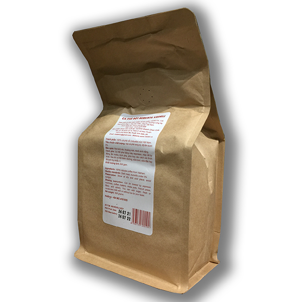 Quy cách đóng gói: Túi zipper chuyên dụng có van thoát khí một chiều theo tiêu chuẩn cà phê đặc sản rang xay quốc tế.